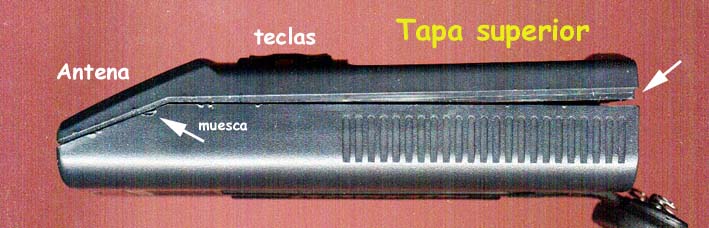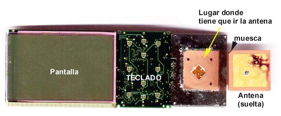 Aquí se muestra la cara oculta de placa base después de haber quitado los tornillos. Se ve la pantalla, el sitio donde el teclado se asienta, y el sitio donde debe colocarse la antena. Además, muestro la otra cara de la antena, en su correcta posición. El punto central de la antena que se ve en esta imágen, tiene continuidad con el contacto central que se ve en la imagen de la izquierda. En el lugar que dice "Lugar donde tiene que ir la antena", hay un hueco, y en él, una pequeña pieza metálica suelta que tiene un pequeño ensanchamiento. Este ensanche evita que se cuele por el agujero, pero como está suelto, le permite bascular para que al mismo tiempo que la antena se ajuste a la superficie, se mantenga en íntimo contacto con ella. |
