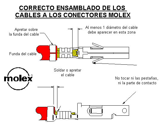 Como es el caso del conector tradicional, el eplug está formado por 8 piezas. Tres de ellas son de plástico y constituyen el verdadero conector. Cuatro son pines. Esta vez son diferentes. Los fabrica una empresa americana, Molex, y están especialmente diseñados para ser introducidos lateralmente y para ser unidos a los cables de la forma más fácil posible: o se aprietan con un alicate de puntas finas, o simplemente se sueldan. Aquí teneis un diagrama de cómo deberiais unir o soldar los cables. El truco es "pillar" algo de la envuelta del cable en la primera sección, para que el enganche tenga más fuerza. No es crítico de todos formas. Esta imágen no corresponde al conector que se usa en el eplug, pero da una clara idea de cómo hay que enganchar el cable.