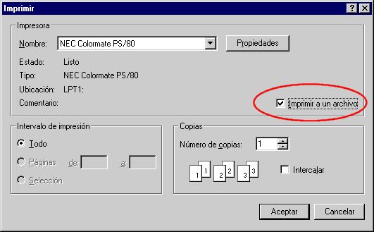 casilla que dice "Imprimir en un archivo" (que he marcado con la elipse